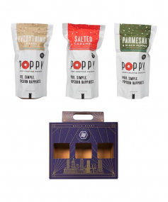 Lights, camera, snack-tion! Three blockbuster popcorn flavors have been assembled for your chewing pleasure. Includes: Poppy Handcrafted Popcorn Everything Bagel Popcorn (2.75 oz), Poppy Handcrafted Popcorn Parmesan Black Pepper Popcorn (3 oz), and Poppy Handcrafted Popcorn Salted Caramel Popcorn (9 oz). Complies with Prop 65.