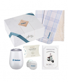Ignite warm & fuzzy feelings with a gift that has something sweet, something soft, & a something for sipping! This cozy kit is perfect as an elevated gift. Includes: Makabi & Sons Capri Cookies (3.6 oz), McCrea's Caramels Cape Cod Sea Salt Caramels (1.4 oz), & cozy, customizable swag: Neon Cube Vanilla Lip Moisturizer, Stainless Steel Stemless Wine Glass, & a Mink Sherpa Blanket. Everything comes packaged with a handwritten, personalized card for your recipient(s). Complies with FDA, Prop 65. 9.75" W x 11.375" L x 3" H